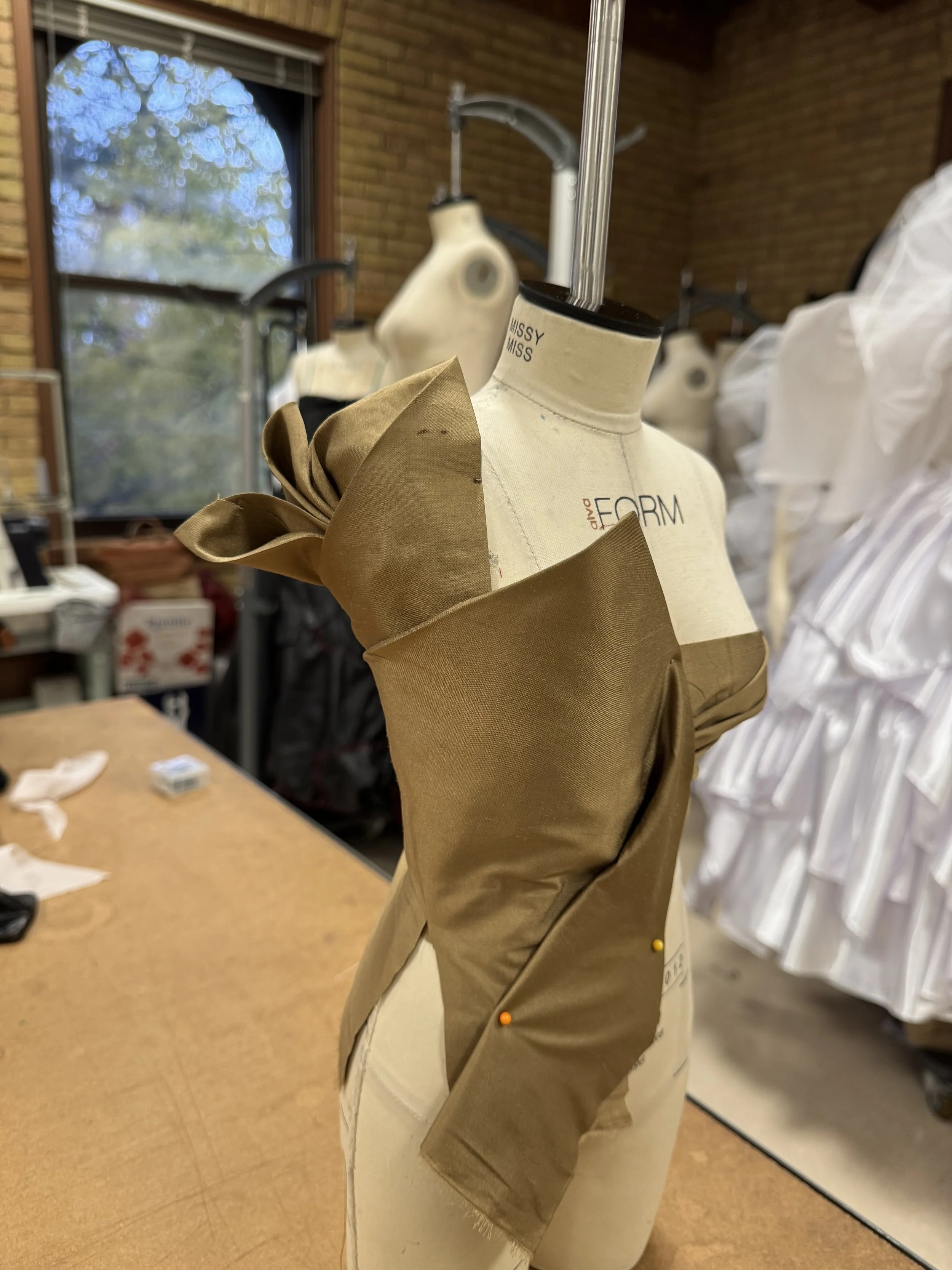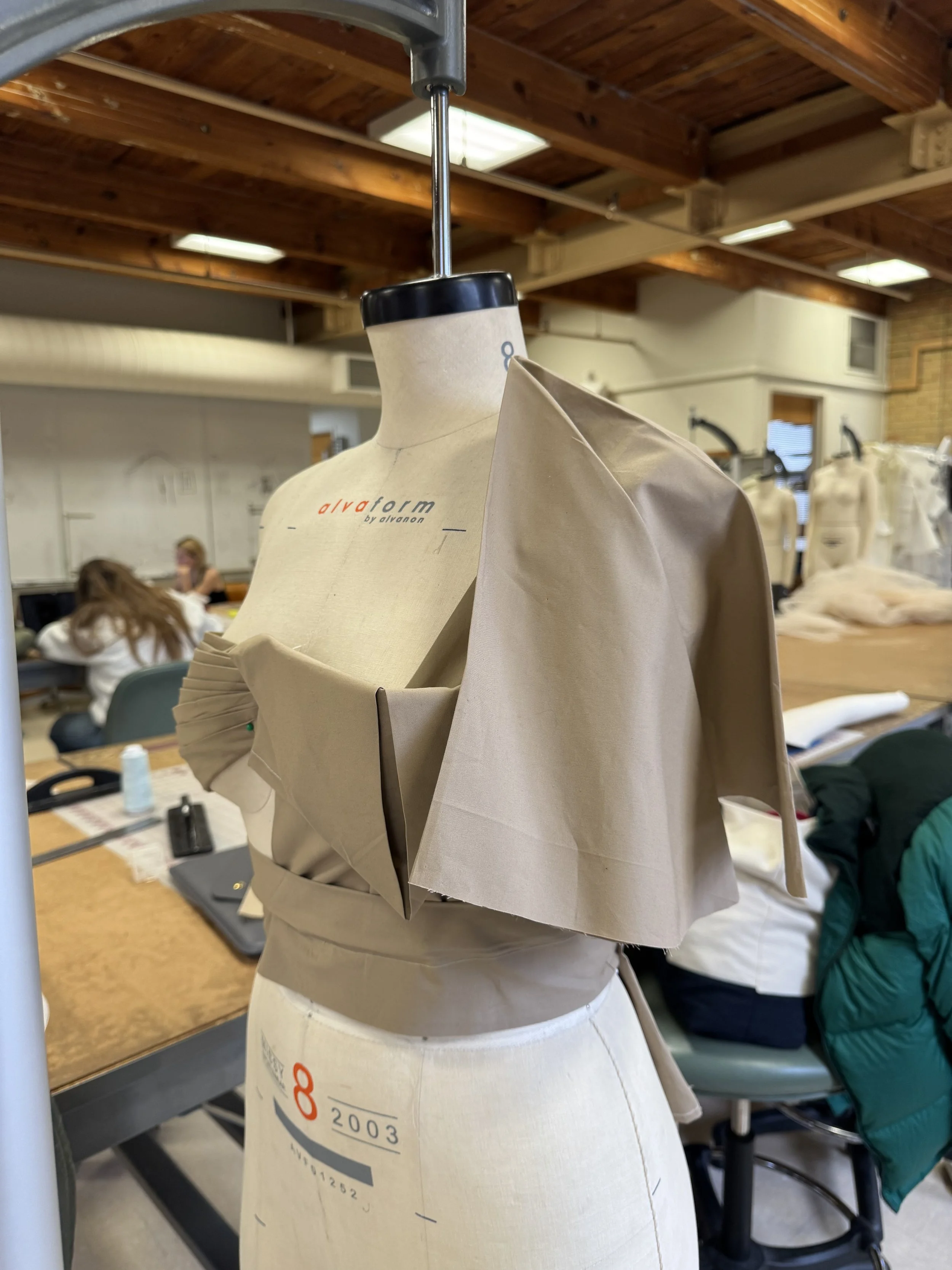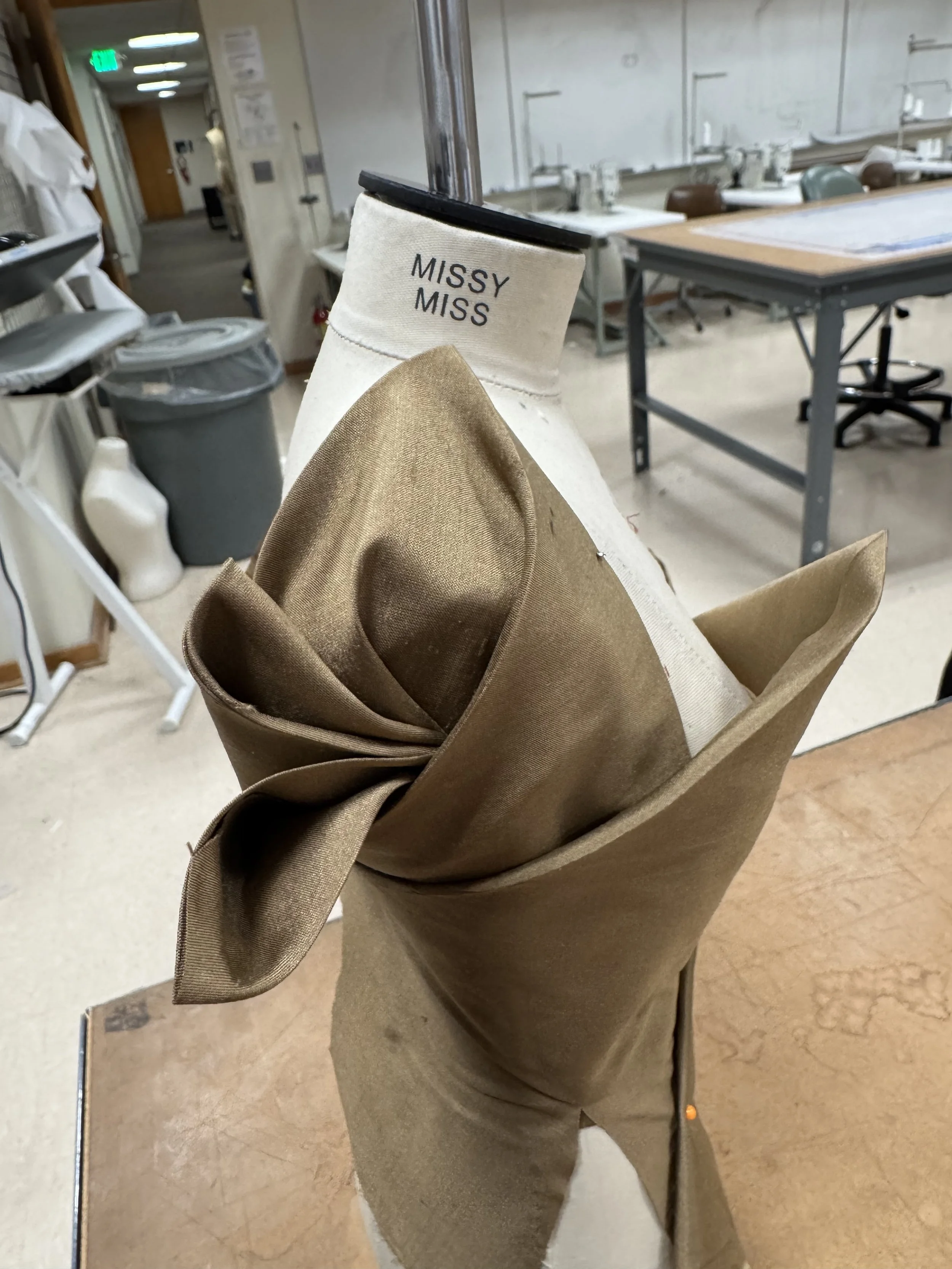 3. Layered fabric pieced together after iron pressing to add shape and fullness. Created a skirt like garment.