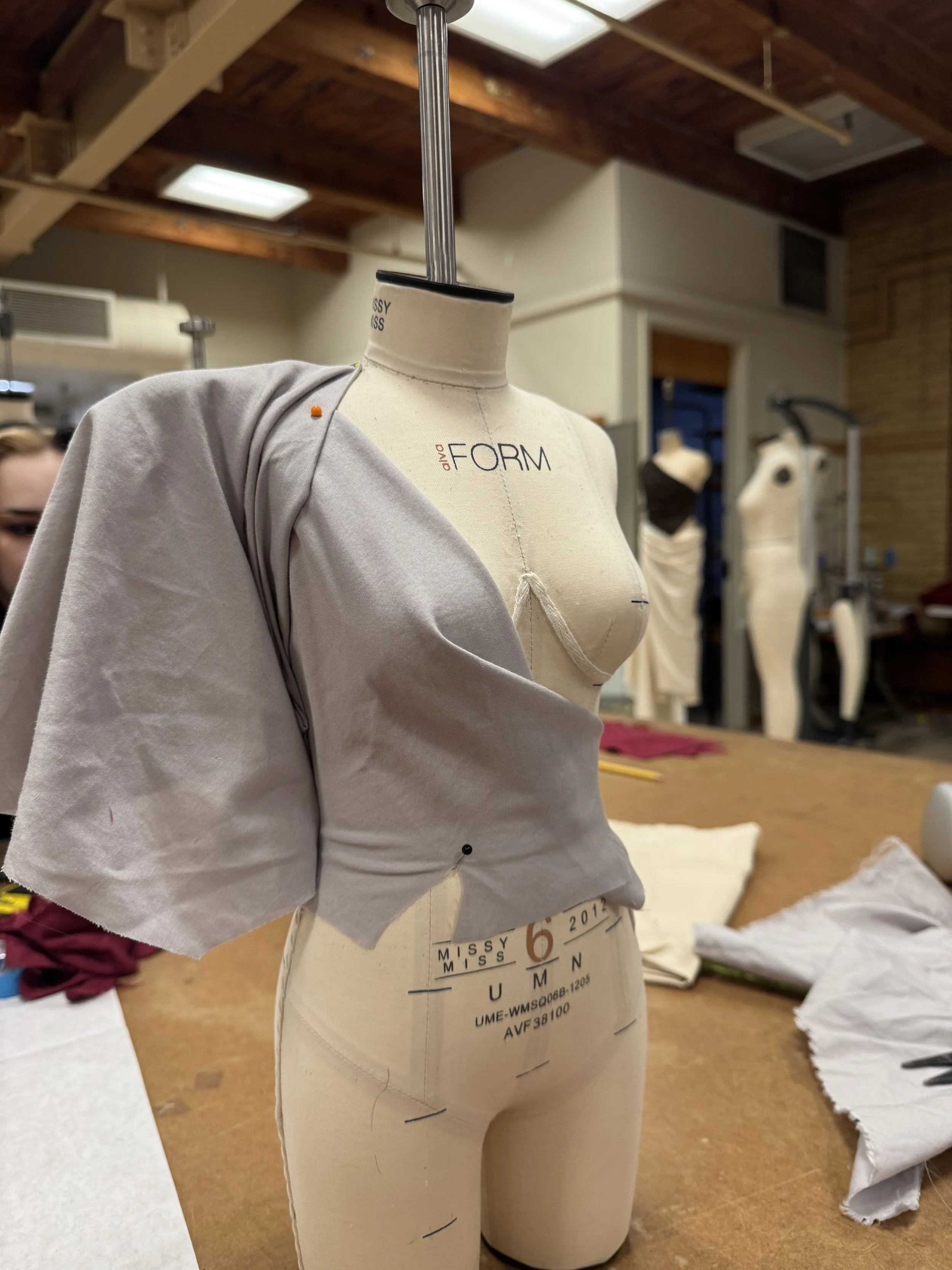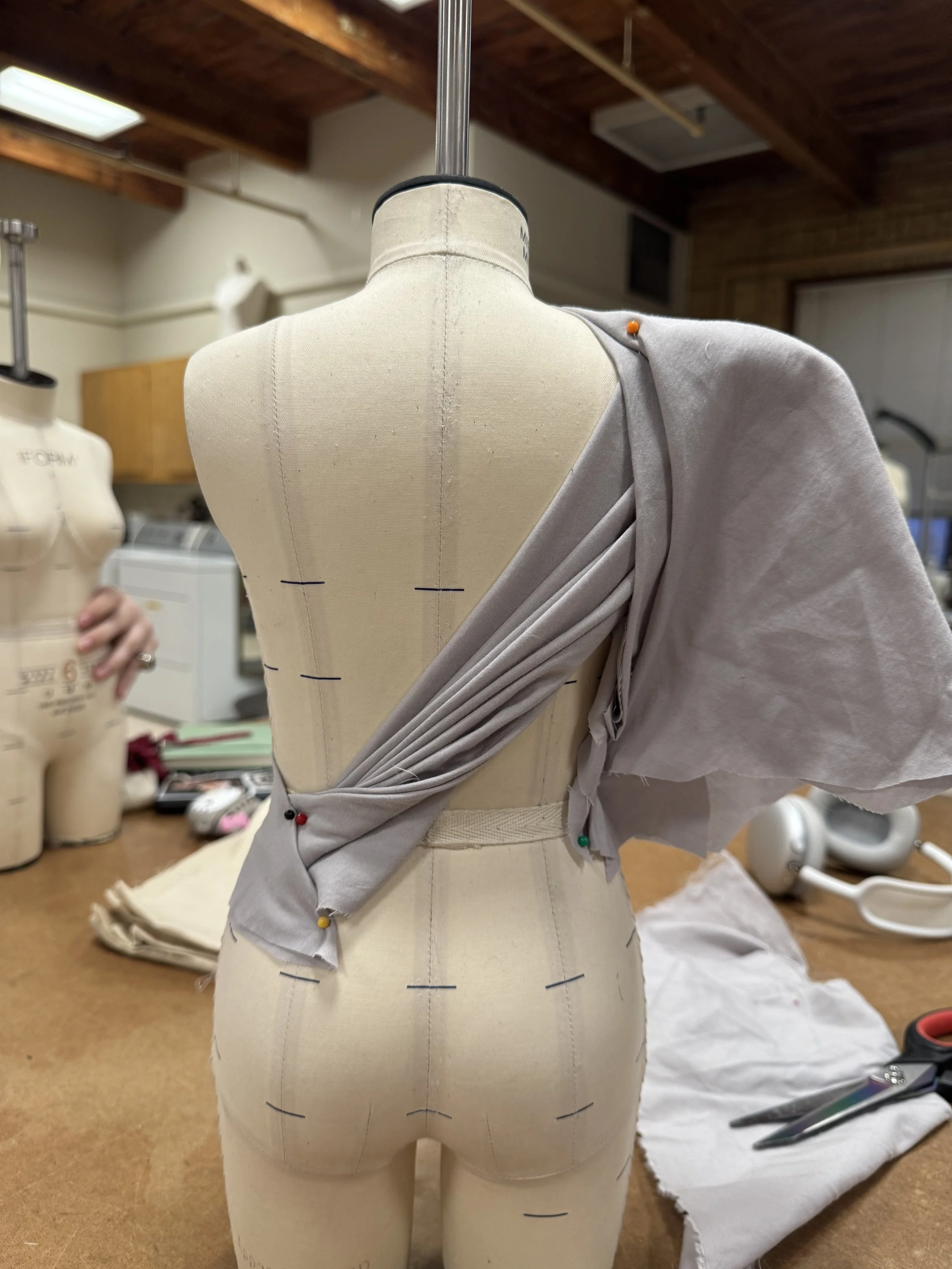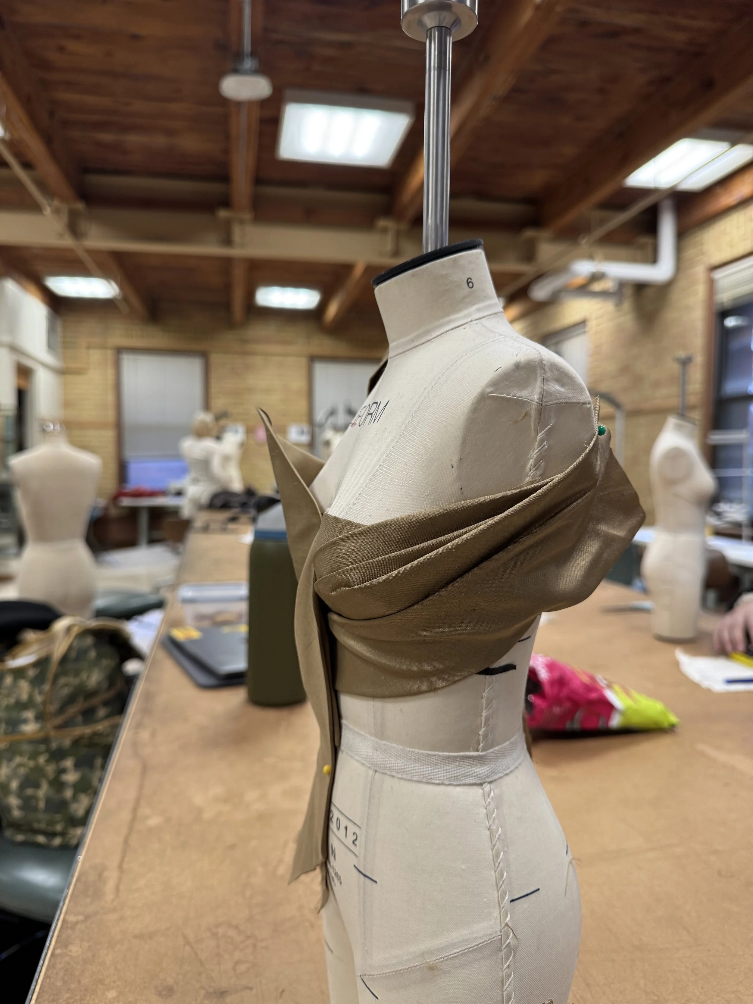2. Experimenting with created shoulder pads and twisting pleated fabric. Attempting to create a more structured appearance.